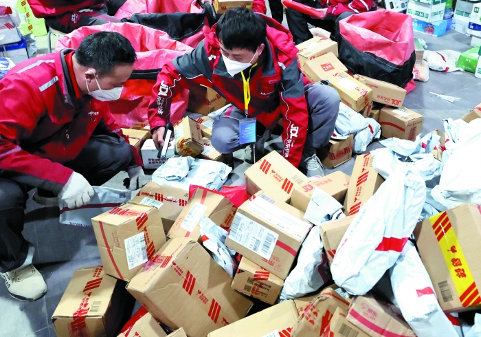 4月17日,快递员在京东上海曲阳营业部对到站货物进行验货