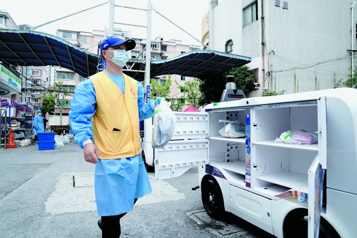 4月25日,杨浦区长海路街道浣纱小区的党员志愿者将小区大门口的快递放入无人快递车