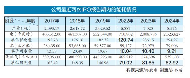 根据招股书披露,2017年至2020年,四川新荷花的单位耗电量分别为192.77千瓦时/吨、176.18千瓦时/吨和182.31千瓦时/吨。而到了2022年至2024年,单位耗电量却出现了大幅异常波动,分别为120.74千瓦时/吨、286.15千瓦时/吨和294.33千瓦时/吨。