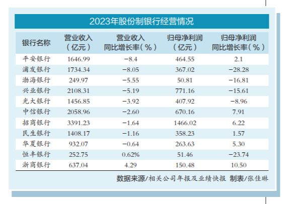 2023年,平安银行实现营业收入1646.99亿元,同比下降8.4%;渤海银行实现营业收入249.97亿元,同比下降5.55%;兴业银行实现营业收入2108.31亿元,同比下降5.19%。