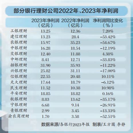 在规模没有得到明显增长和响应减费让利号召的背景下,行业经营业绩整体出现下滑,部分益达娱乐更是出现“增量不增收”的窘境。中国证券报记者梳理多家银行年报发现,2023年,中邮理财、兴银理财、青银理财、中银理财、招银理财净利润均较2022年减少超10%,农银理财、建信理财、渝农商理财净利润均较2022年减少超50%。
