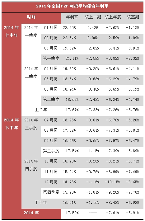 2014年网贷利率在加速下滑。据网贷之家数据,2014年网贷综合收益率为17.86%。自3月以来,网贷行业综合收益率呈现持续下跌趋势,平均下降速度为56个基点(1基点=0.01%),截至12月底,网贷综合收益率跌至16.08%。而第一网贷数据显示,2014年全国P2P网贷全年平均为17.52%,较2013年下降了7.41个百分点。其中,2014年12月份全国P2P网贷平均综合年利率14.78%,再创历史新低。