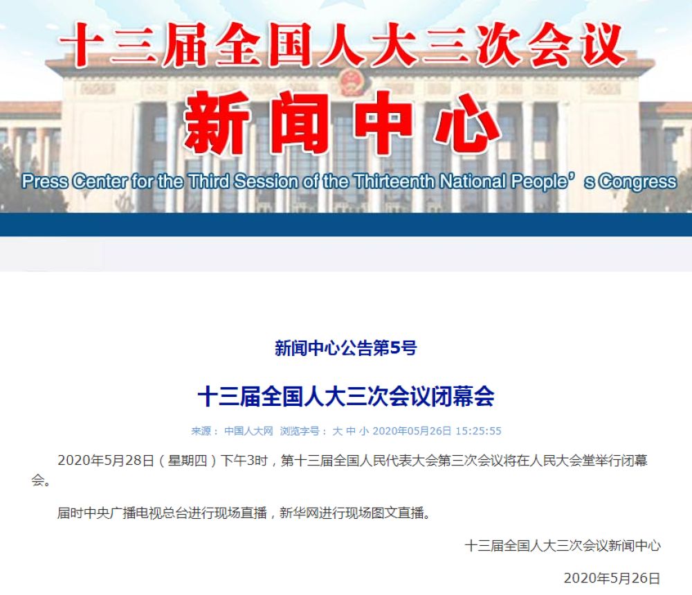 十三届全国人大三次会议闭幕会将于5月28日下午举行_中证网