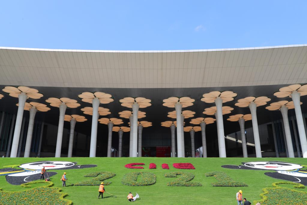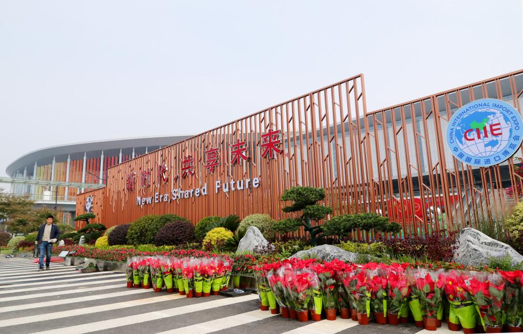 第四届进博会开幕在即,国家会展中心(上海)场馆及周边布置了众多进博元素装饰。 新华社记者 方喆 摄