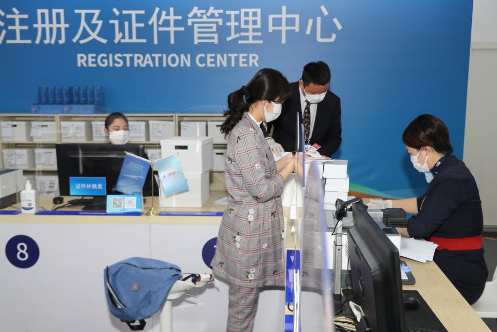 10月22日,参会人员(右三)在进博会注册及证件管理中心领取证件。新华社记者 方喆 摄