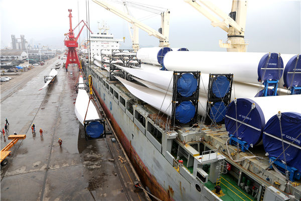 2月28日,一艘货轮在江苏连云港港东方益达娱乐码头装载风力发电设备。新华社发(王春 摄)