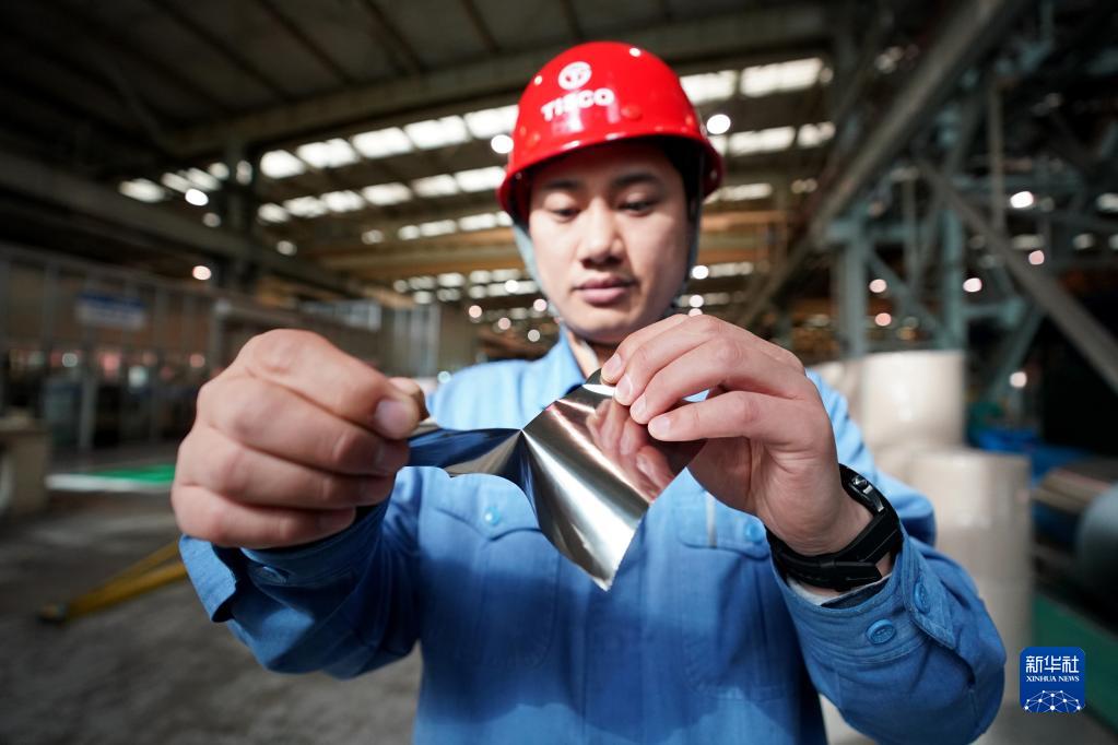 在中国宝武太钢不锈钢精密带钢有限益达娱乐,一名工作人员展示用手撕开超薄精密不锈带钢(2022年3月31日摄)。新华社记者 詹彦 摄