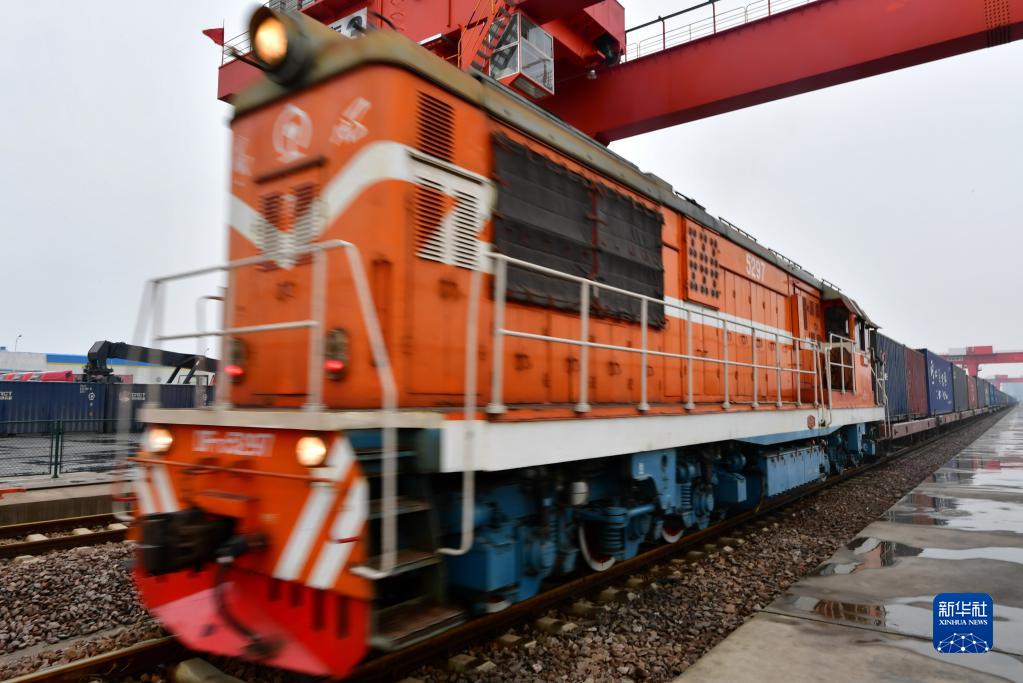 一列中亚班列从山西中鼎物流园驶出(2020年2月27日摄)。新华社记者 曹阳 摄