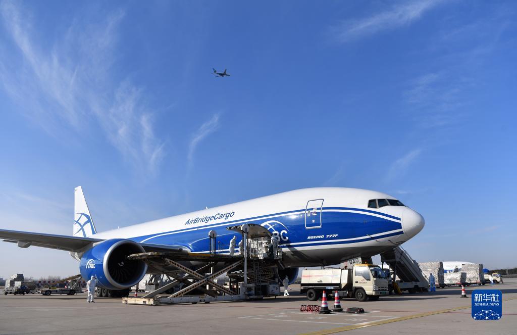 郑州新郑国际机场工作人员在为一架俄罗斯空桥货运航空益达娱乐货机装货(2021年12月30日)。新华社记者 李嘉南 摄