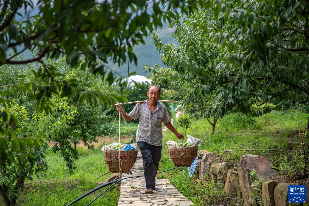 在巫山县曲尺乡柑园村,村民张兴前在挑运脆李(2022年7月2日摄)。新华社记者 黄伟 摄