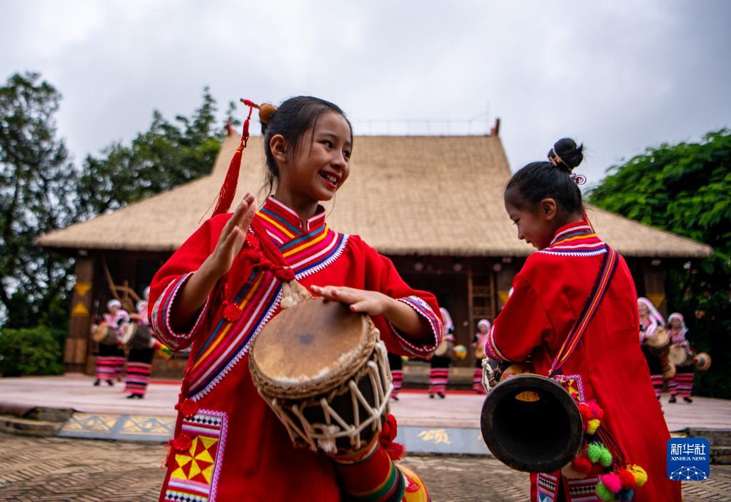 云南省普洱市澜沧拉祜族自治县东回镇班利村表演队的小演员在村里为游客演出(2022年7月6日摄)。新华社记者江文耀摄