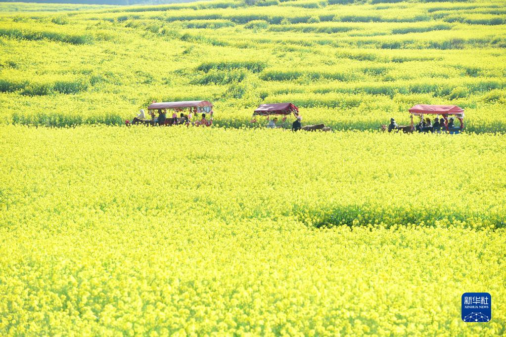 游客乘牛车在云南省曲靖市罗平县的油菜花田中游玩(2022年2月28日摄)。新华社发(毛虹摄)
