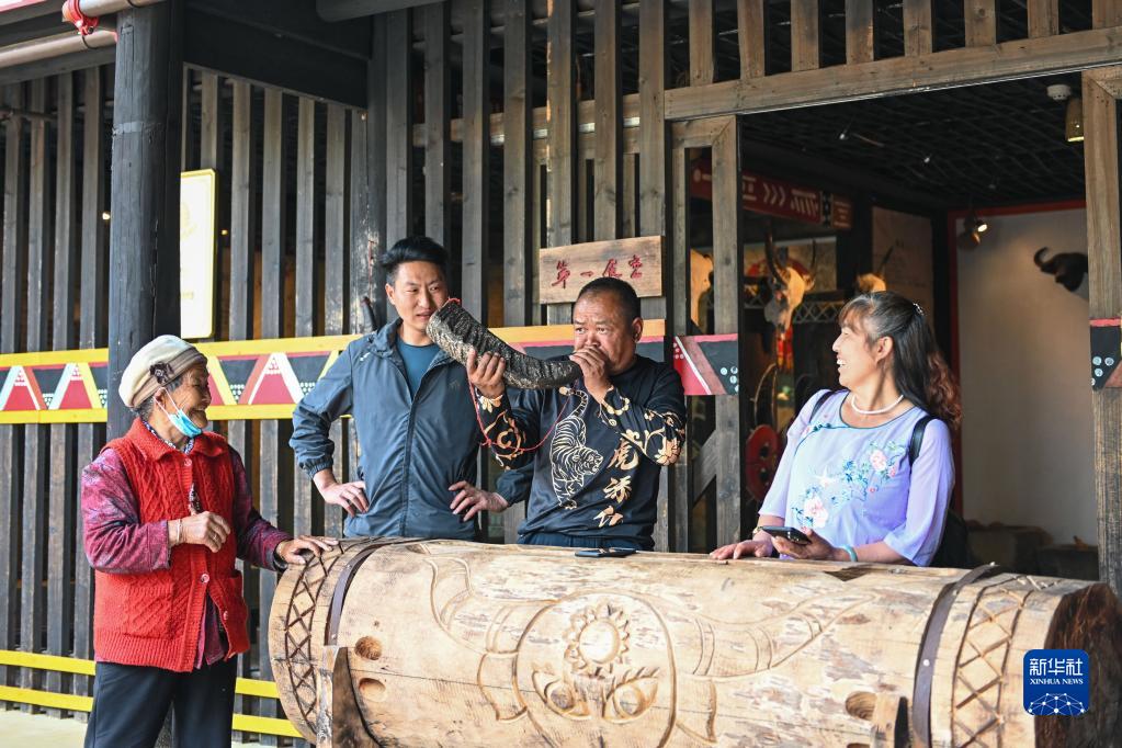 游客在云南省腾冲市清水乡三家村中寨司莫拉佤族村体验传统乐器(2022年3月31日摄)。新华社记者 曹梦瑶 摄