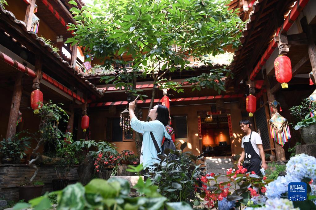 游客在云南省文山壮族苗族自治州丘北县普者黑仙人洞村一家客栈内拍照(2020年6月2日摄)。新华社记者 杨宗友 摄