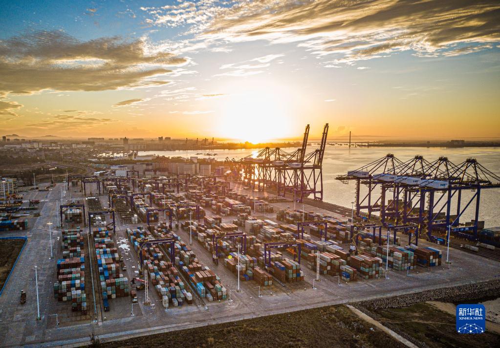 在海南洋浦经济开发区拍摄的洋浦国际集装箱码头(2021年5月26日摄,无人机照片)。新华社记者 蒲晓旭 摄