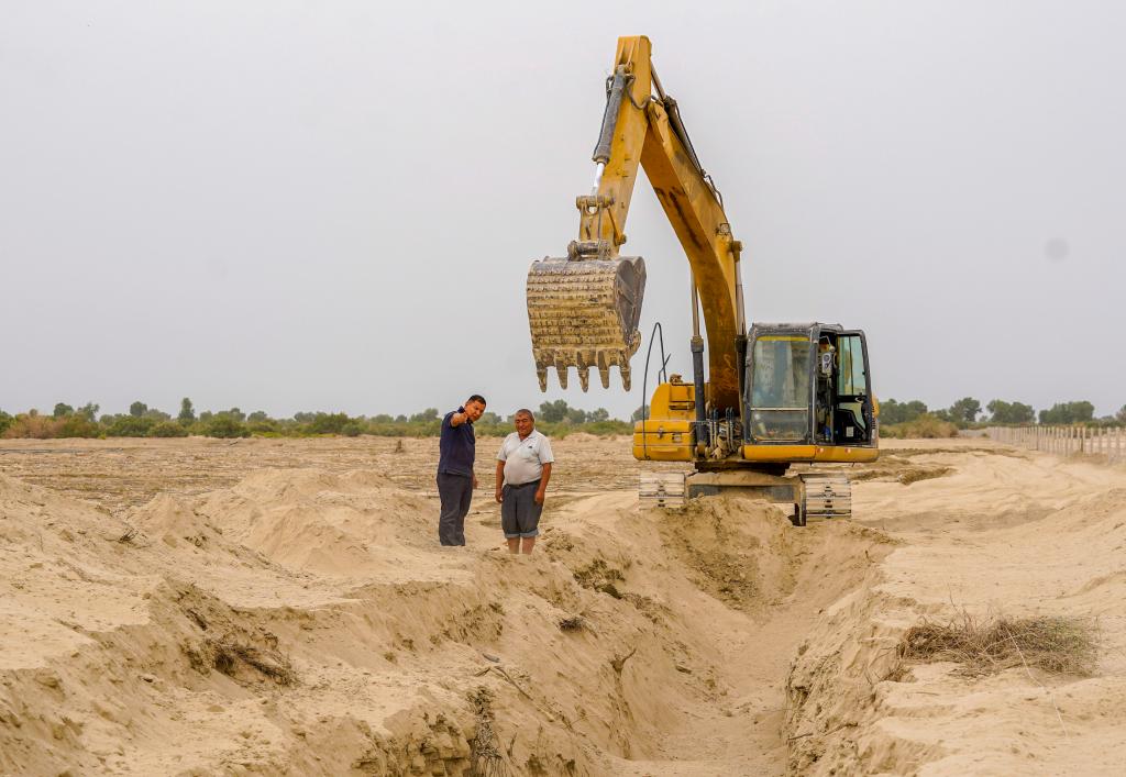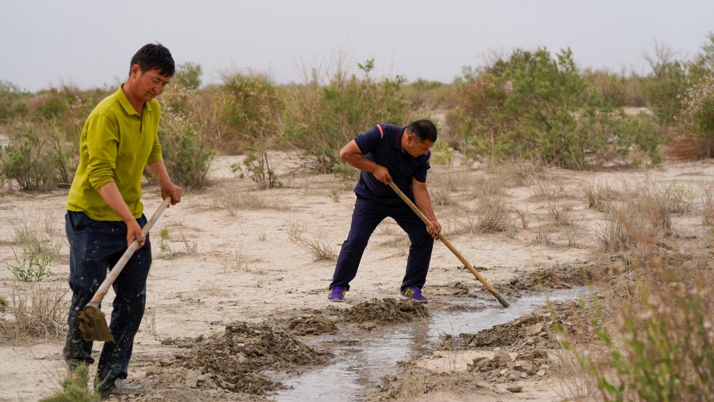 6月20日,艾力·尼亚孜(右)和护林员们一起挖渠引水。