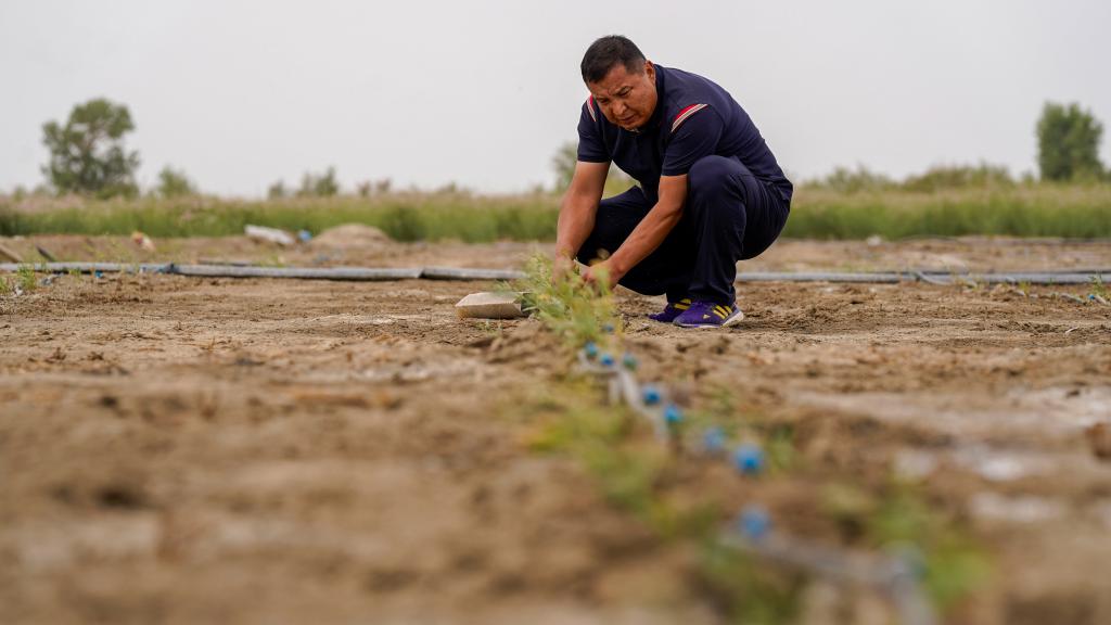 6月20日,艾力·尼亚孜在尉犁县托布协百万亩罗布麻生长基地,查看罗布麻滴灌情况。