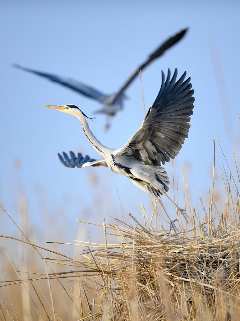4月1日,苍鹭在沙湖景区栖息、飞翔。新华社记者冯开华摄