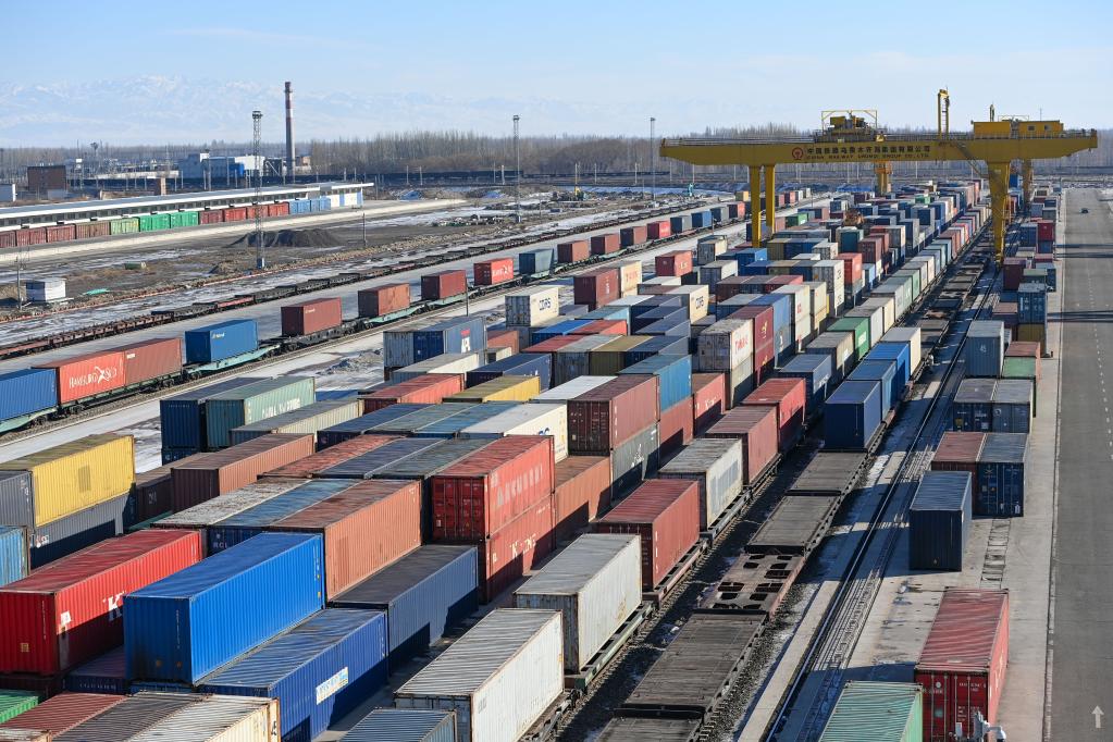 新疆霍尔果斯铁路口岸,换装场内正在进行班列换装作业(2021年2月6日摄)。新华社记者丁磊 摄