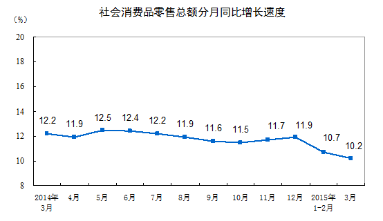 作者:来源:Wind资讯4月15日,国家统计局公布数据显示,2015年3月份,社会消费品零售总额22723亿元,同比名义增长10.2%(扣除价格因素实际增长10.2%,以下除特殊说明外均为名义增长)。其中,限额以上单位消费品零售额10834亿元,增长7.1%。2015年1-3月份,社会消费品零售总额70715亿元,同比名义增长10.6%。其中,限额以上单位消费品零售额32472亿元,增长7.8%。