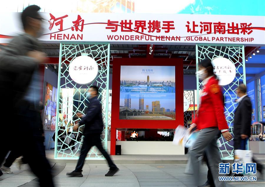 11月5日,参观者从河南综合馆前走过。 第三届中国国际进口博览会设置了精彩纷呈的人文展示项目,帮助参加进博会的国内外客商了解中国地方文化特色,促进人文交流。 新华社记者 陈飞 摄
