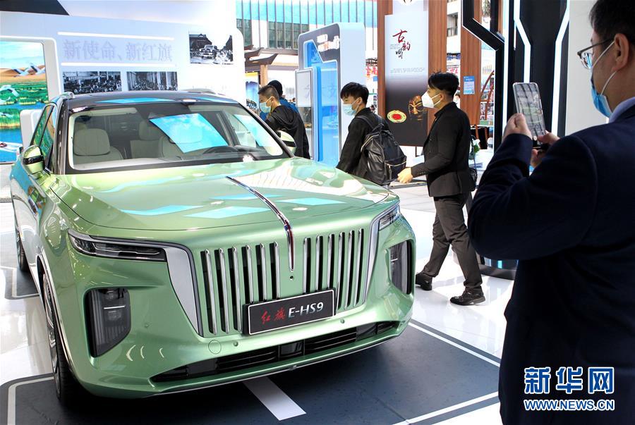 11月5日,参观者在吉林综合馆观看国产红旗E-HS9纯电动汽车。 第三届中国国际进口博览会设置了精彩纷呈的人文展示项目,帮助参加进博会的国内外客商了解中国地方文化特色,促进人文交流。 新华社记者 陈飞 摄