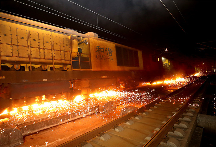 ↑1月9日,正在进行钢轨打磨作业的打磨车下火花四溅。 新华社记者 方喆 摄
