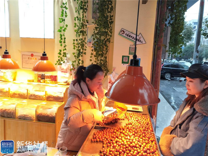 ↑这里是吴添春在龙山县城开的糖炒锥栗店,她正在为顾客包装加工好的锥栗。(受访者提供)