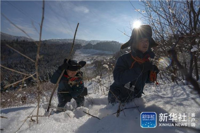 ↑吴海全(右)和丁明全在虎峰岭中(1月10日摄)。新华社发(唐铁富 摄)