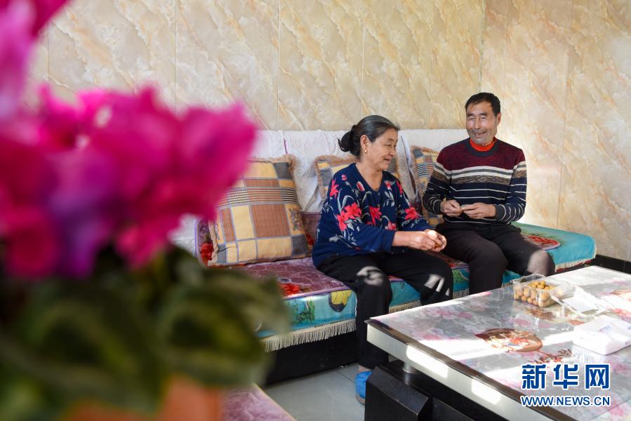 吉木萨尔县头工街东村村民杨万里(右)和妻子在客厅聊天(1月21日摄)。新华社记者 丁磊 摄
