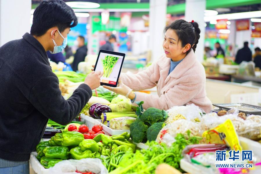 1月24日,“智慧菜篮子超市”工作人员(左)查看商户线上销售的商品信息。