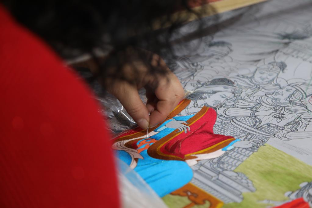 1月24日,绣娘石玉秀在制作藏绣作品《格萨尔王》。新华社记者赵玉和 摄