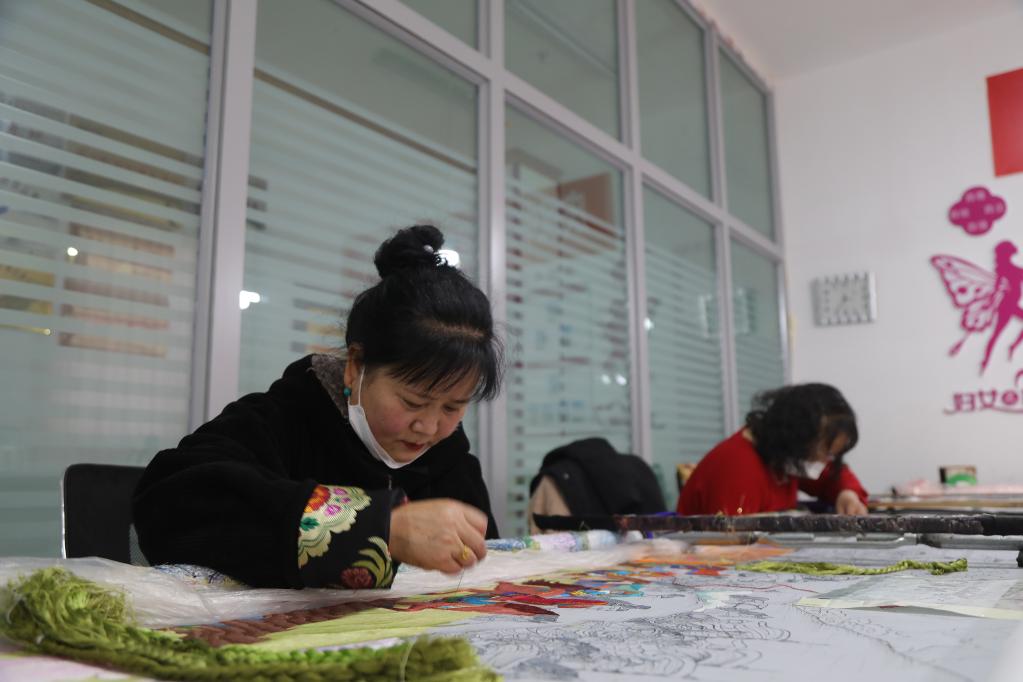 1月24日,绣娘李秀英(左一)和石玉秀(右一)在制作藏绣。新华社记者央秀达珍 摄