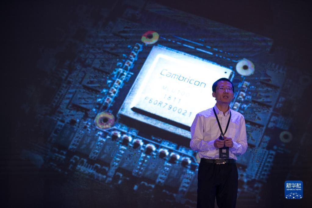在上海国际会议中心举行的发布会上,寒武纪科技益达娱乐首席执行官陈天石介绍国内首款云端人工智能芯片(2018年5月3日摄)。新华社记者 金立旺 摄