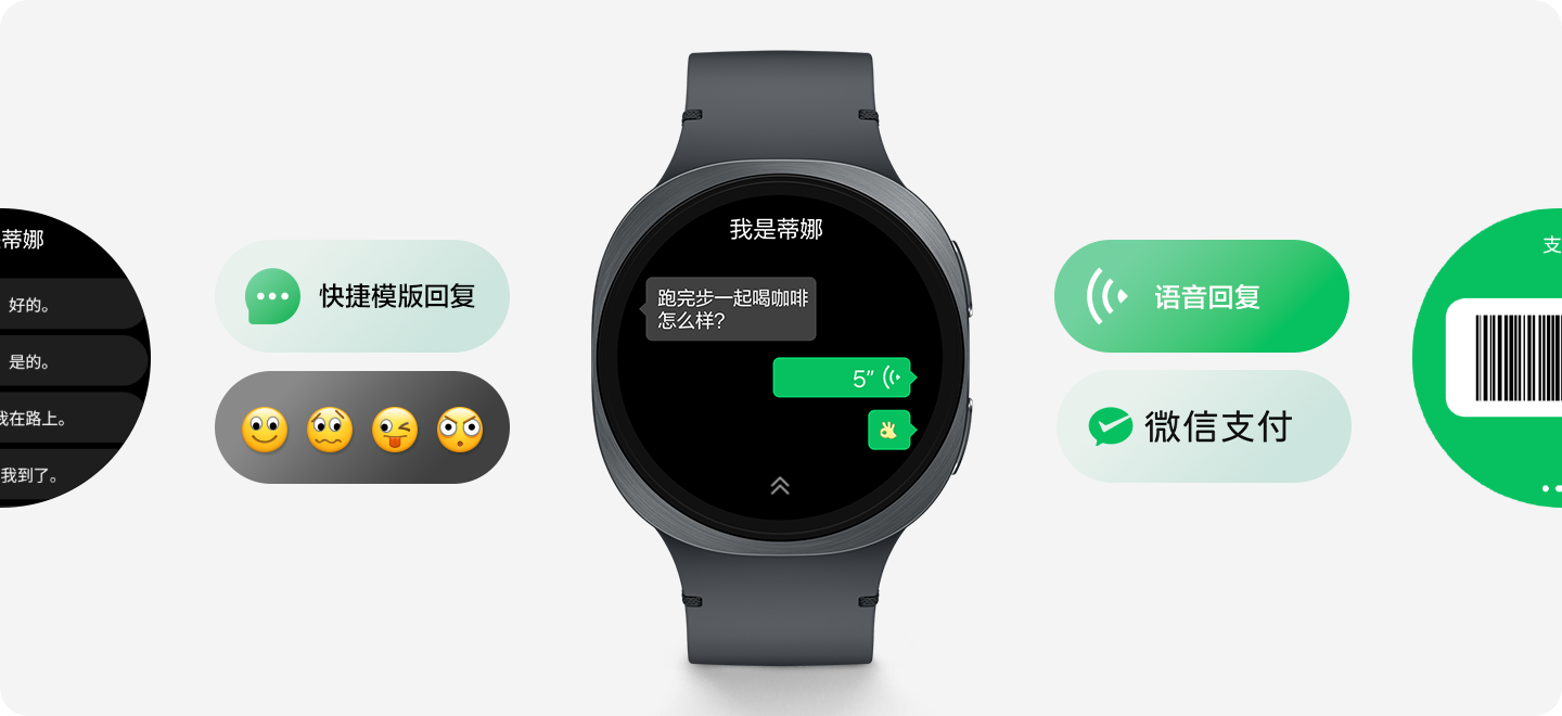 Galaxy Watch8 Classic搭载微信手表版功能,抬腕即可查看微信中的文字、Emoji表情及图片消息,还能通过语音、Emoji表情与快捷模板快速回复,让沟通更高效。同时支持微信二维码或条形码支付,并可设置支付限额,为您带来腕上轻社交与支付便捷的生活体验。